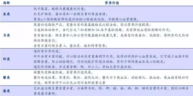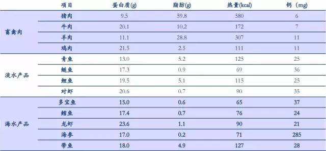 水產(chǎn)品是優(yōu)質(zhì)的食物蛋白源,與肉蛋類食物存在互換性。根據(jù)中國營養(yǎng)學會數(shù)據(jù),將居民經(jīng)常食用的豬牛羊雞等肉類與青魚、鰱魚、鯉魚和對蝦等淡水產(chǎn)品以及多寶魚、鱈魚等海水產(chǎn)品的營養(yǎng)成分進行對比,可以看到,海水產(chǎn)品的蛋白質(zhì)含量較為豐富,且具有低脂肪、低熱量和鈣含量高等優(yōu)勢。