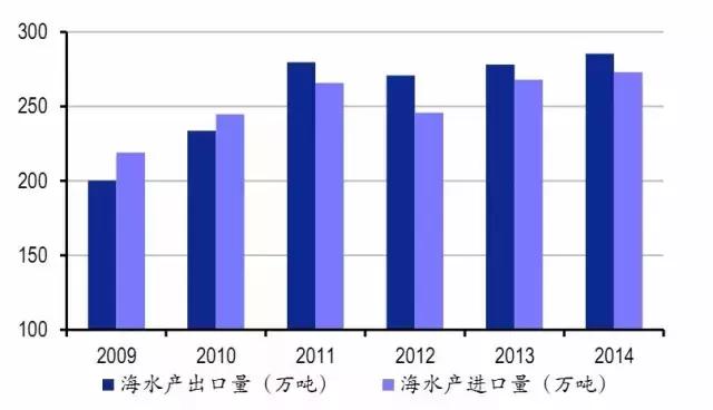 近年來我國海水產(chǎn)品進出口規(guī)模穩(wěn)步增長,2014年海水產(chǎn)品進口量為273.1萬噸,約占水產(chǎn)品進口總量的64%;海水產(chǎn)品出口量為285.4萬噸,約占水產(chǎn)品出口總量的69%。