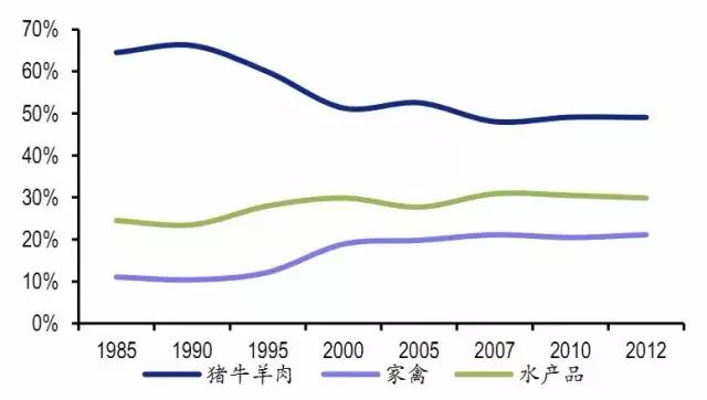 從國內(nèi)肉類消費結(jié)構的變化對判斷未來淡水產(chǎn)向海水產(chǎn)消費升級趨勢有較好的參考價值。