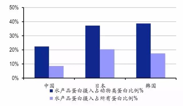 而與那些同飲食習慣相似的韓日等國比較,我國的人均水產(chǎn)消費依舊偏低,水產(chǎn)品蛋白攝入量比重也較韓日有一定差距。
