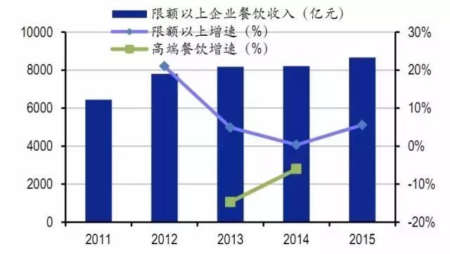 在中央出臺八項規(guī)定的第二年,即是2014年,全國餐飲收入達2.79萬億元,同比增長9.7%,但其中高端餐飲營業(yè)額下降6%(上年下滑幅度為14.7%),人均消費同比下降20%。