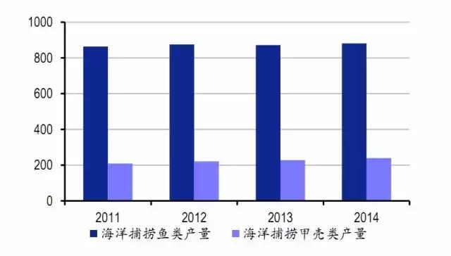 目前我國海水養(yǎng)殖總量已超過海洋捕撈總量,2014年海水產(chǎn)品產(chǎn)量3296萬噸,其中海水養(yǎng)殖產(chǎn)量1813萬噸,占比55%左右。海洋捕撈近年受近海過度捕撈和水域污染等影響,近年產(chǎn)量規(guī)模較為平穩(wěn),2014年海洋捕撈產(chǎn)量1280萬噸左右,占比在海產(chǎn)品供給總量的39%左右;遠洋漁業(yè)捕撈產(chǎn)量則在203萬噸左右,占比不高,但以高價值海水產(chǎn)為主。