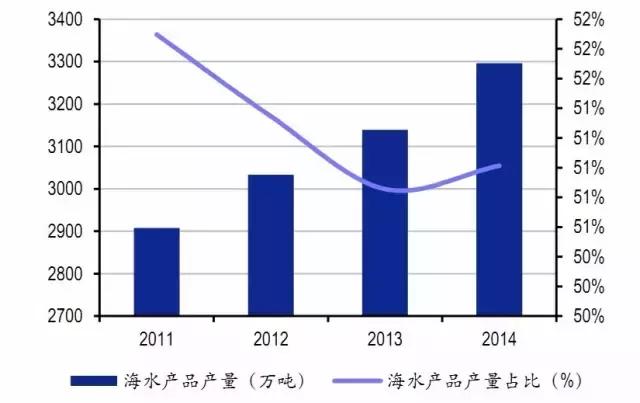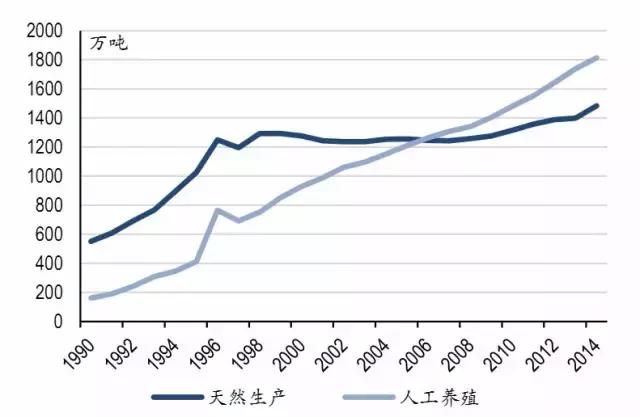 海產(chǎn)品供給當中,人工養(yǎng)殖產(chǎn)量2006年首次超過海洋捕撈,2014年人工養(yǎng)殖海產(chǎn)品產(chǎn)量1812.65萬噸,超過捕撈量329萬噸,占海產(chǎn)品總產(chǎn)量比重55%。
